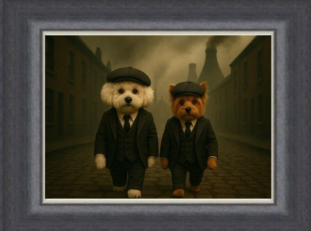 How Gorgeous are these Peaky Pooches! They make a great addition to any room in your home. Framed in a grey charcoal frame with a champagne trim, the frame complements the art work perfectly.